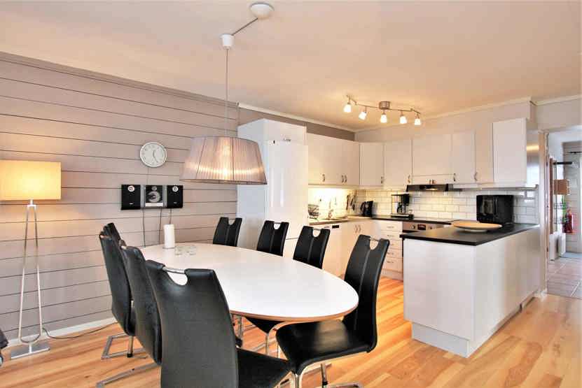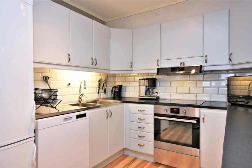Køkkenet indeholder komfur med ovn, mikro, køleskab med fryser, opvaskemaskine.
