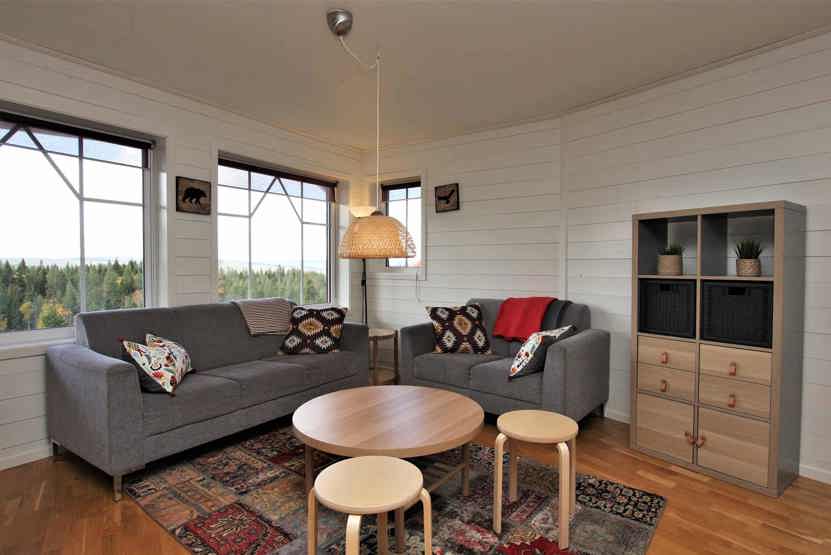 Nedre Grizzlyhusen ligger i Björnrike. Lejlighed på første etage, 5 sengepladser, 55 kvm, alrum med køkkenafdeling, 2 soveværelse, 1 bruser, 1 WC, sauna.
