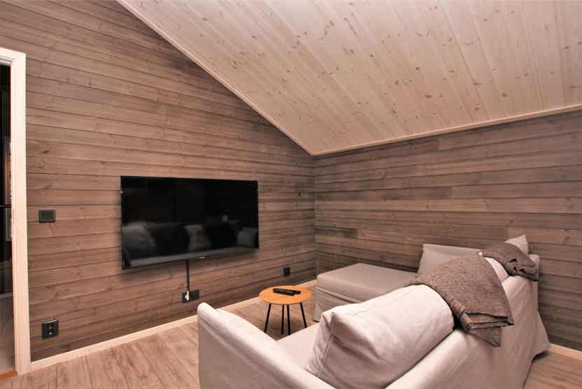 Stue med TV, lille køkkenafdeling, brændeovn (brænde indgår ikke).