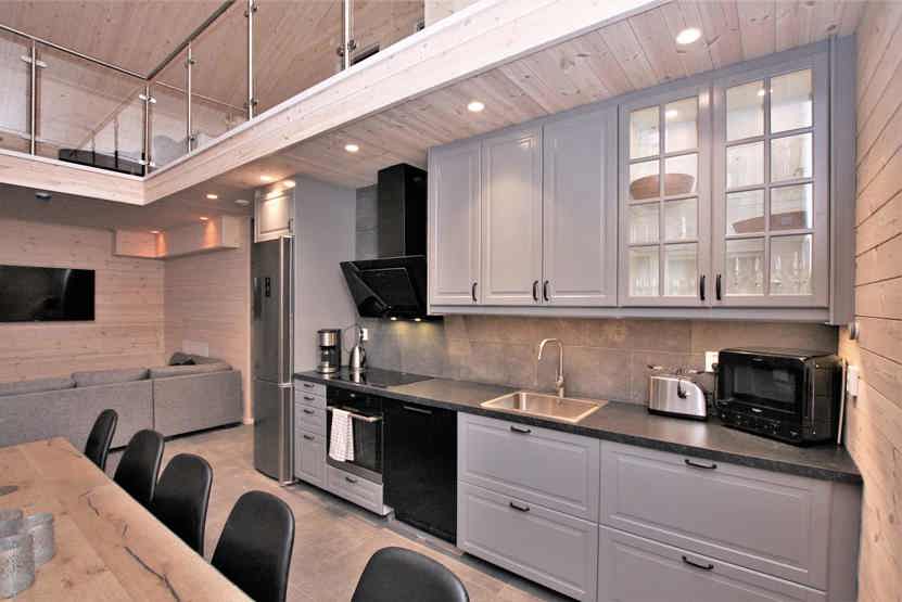 Køkkenet indeholder komfur med ovn, mikro, køleskab med fryser, opvaskemaskine.