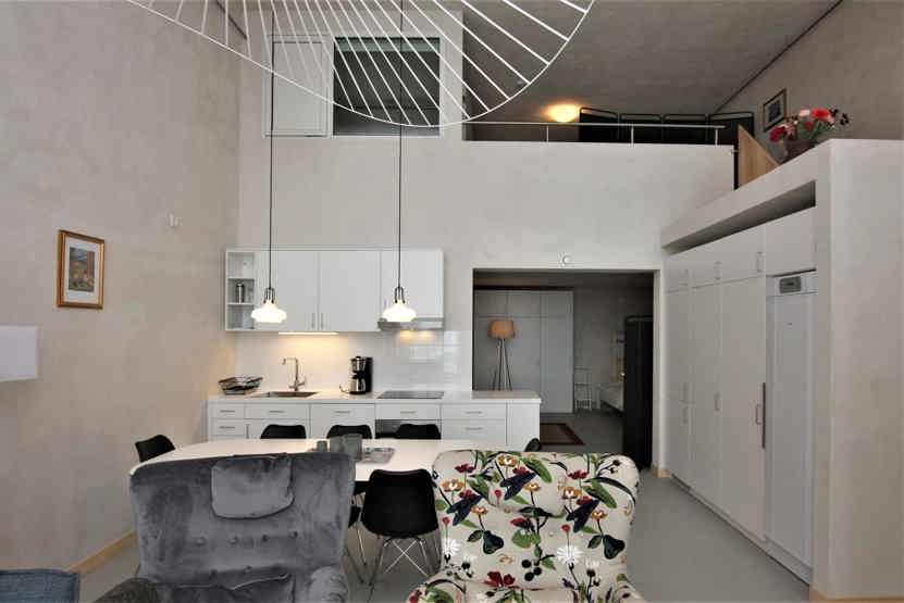 Køkkenet indeholder ovn, mikro, køleskab med fryser, komfur, opvaskemaskine.