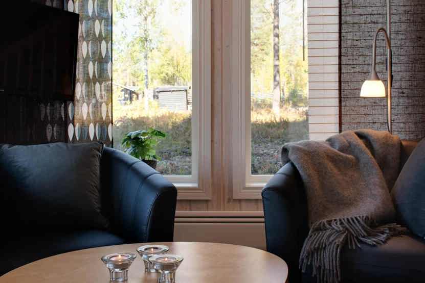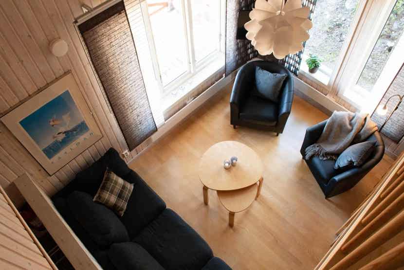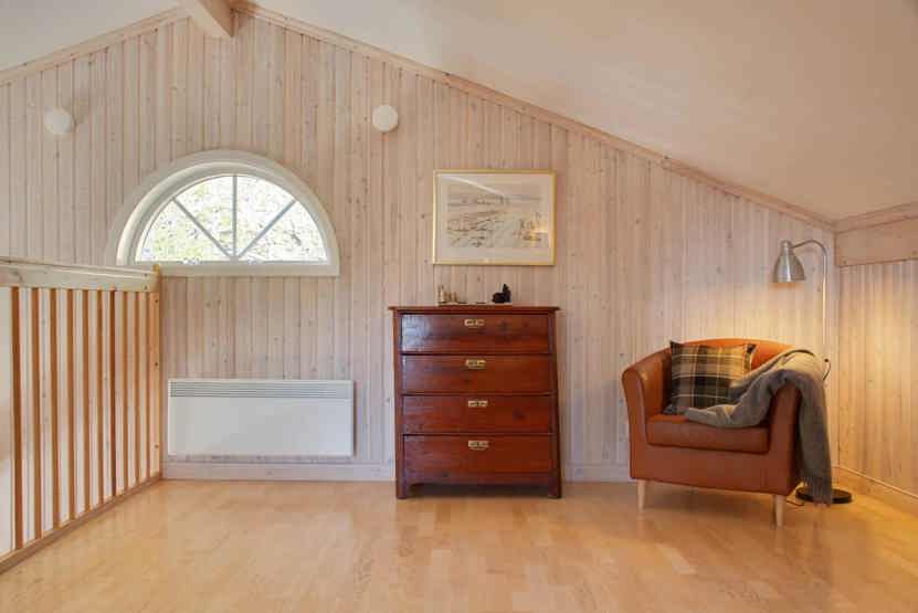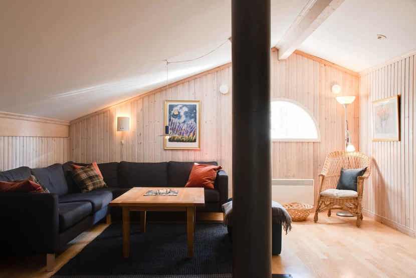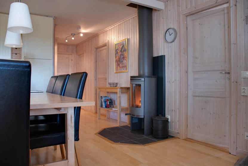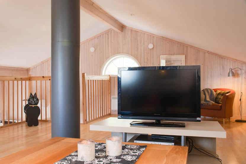 Stue med lille køkkenafdeling, TV, brændeovn (brænde indgår ikke).