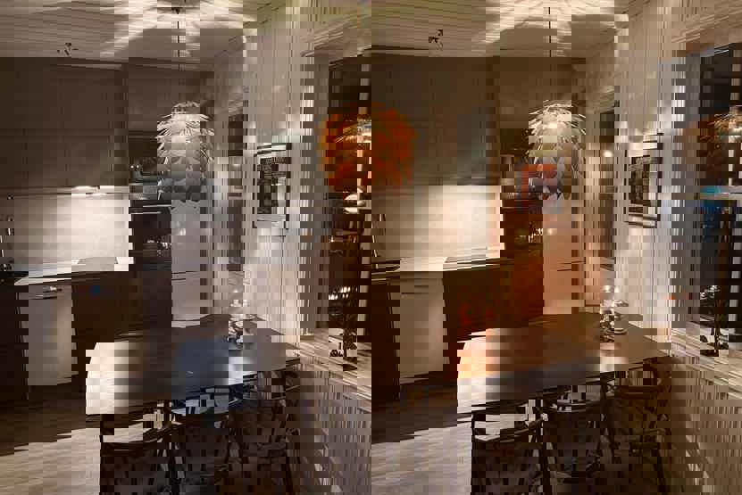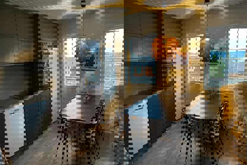 Køkkenet indeholder komfur med ovn, mikro, køleskab med fryser, opvaskemaskine.
