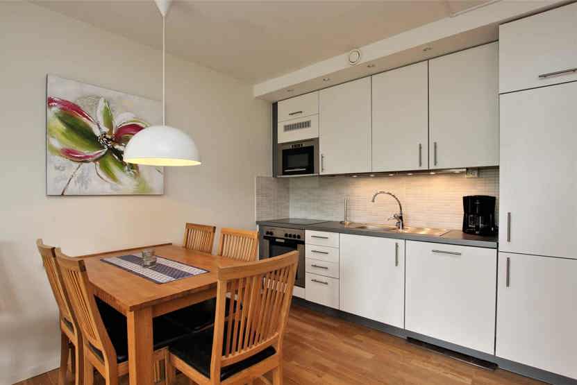 Køkkenet indeholder komfur med ovn, køleskab med fryser, opvaskemaskine, mikro.