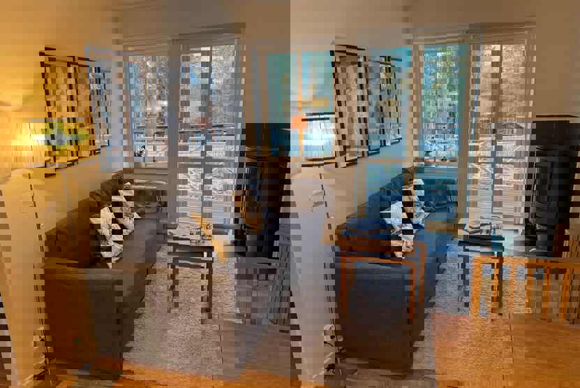 Stue med TV, lille køkkenafdeling, brændeovn (brænde indgår ikke).