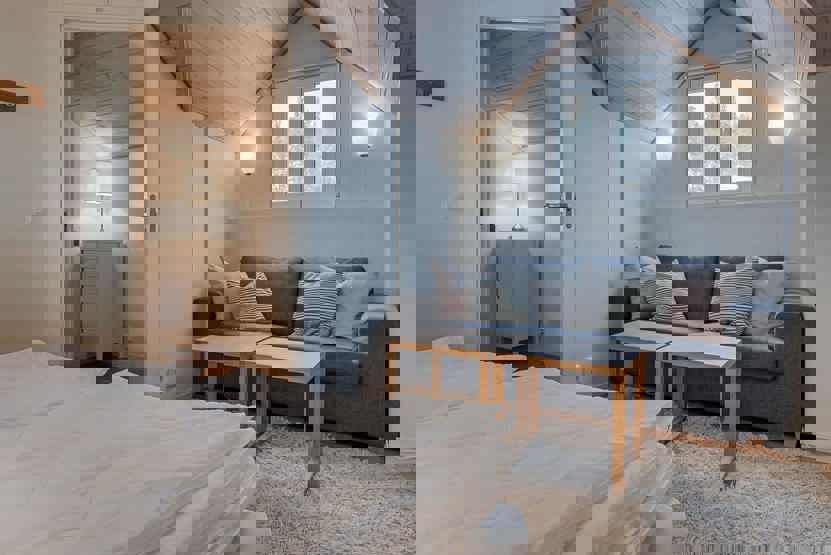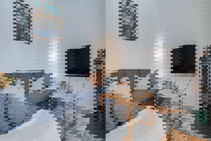 Stue med TV, lille køkkenafdeling, brændeovn (brænde indgår ikke).