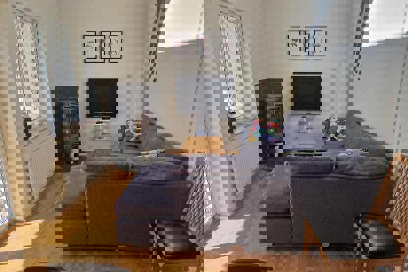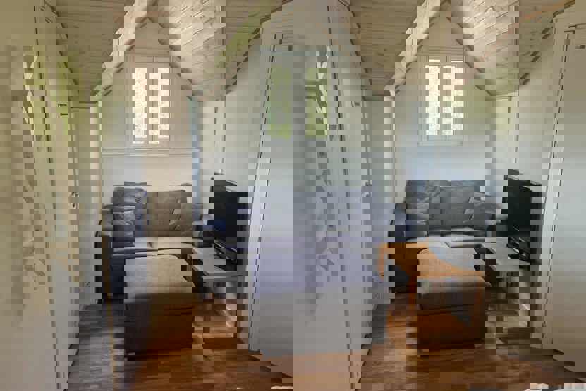 Stue med lille køkkenafdeling, TV, brændeovn (brænde indgår ikke).