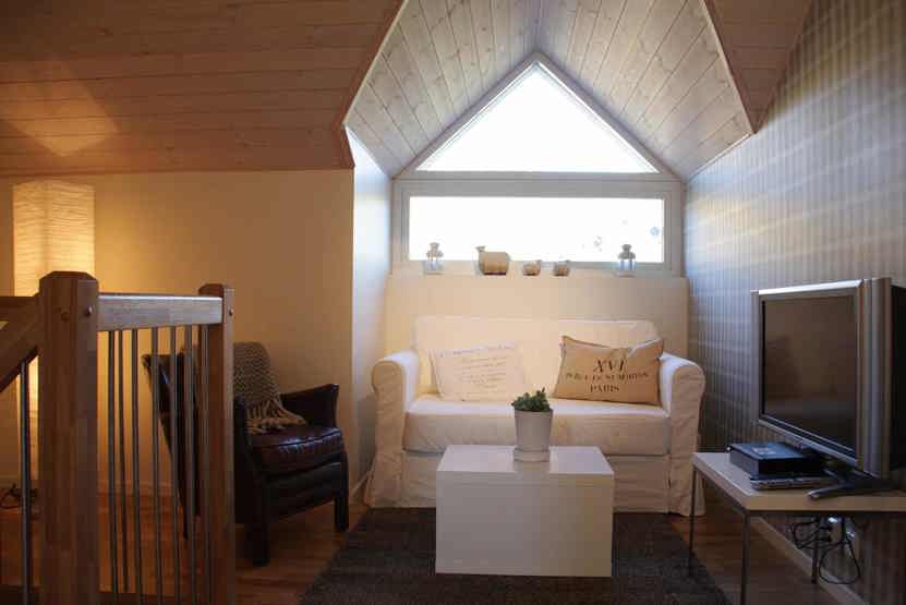 Stue med TV, lille køkkenafdeling, brændeovn (brænde indgår ikke).