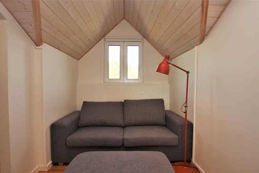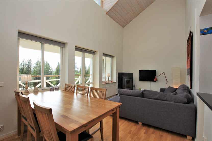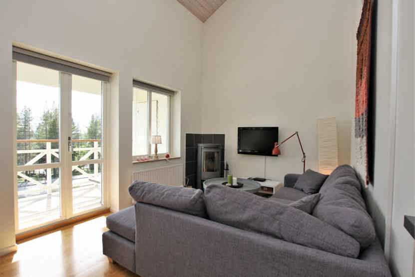 Stue med TV, lille køkkenafdeling, brændeovn (brænde indgår ikke).