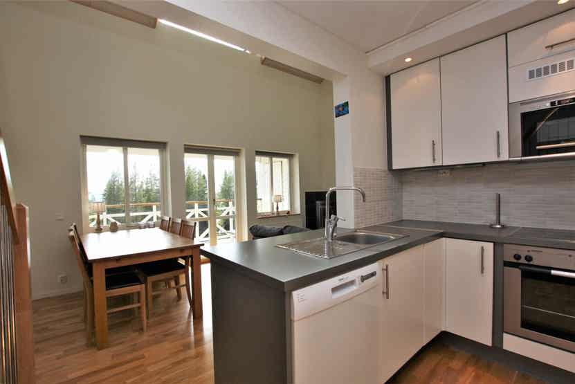 Køkkenet indeholder komfur med ovn, mikro, køleskab med fryser, opvaskemaskine.