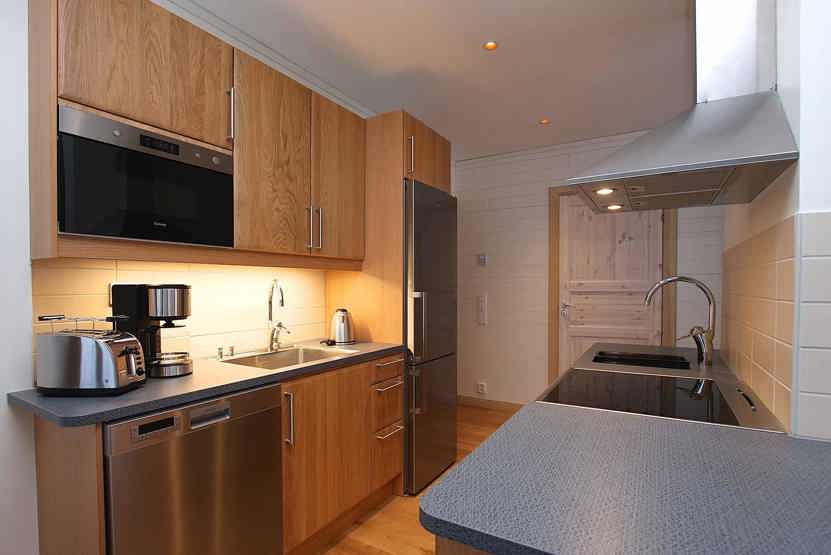 Køkkenet indeholder komfur med ovn, mikro, køleskab med fryser, opvaskemaskine.