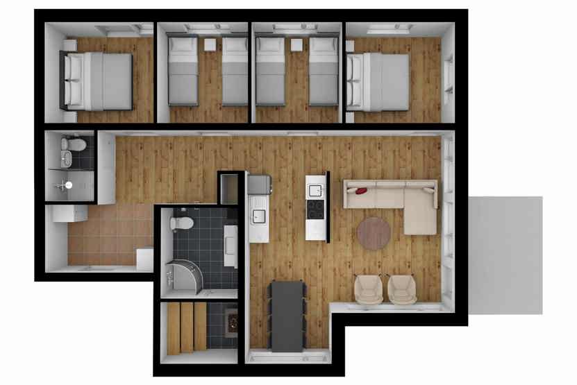 Soveværelse-1 = 1 dobbeltseng. Soveværelse-2 = 2 enkeltsenge. Soveværelse-3 = 2 enkeltsenge. Soveværelse-4 = 1 dobbeltseng.