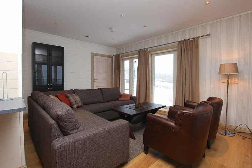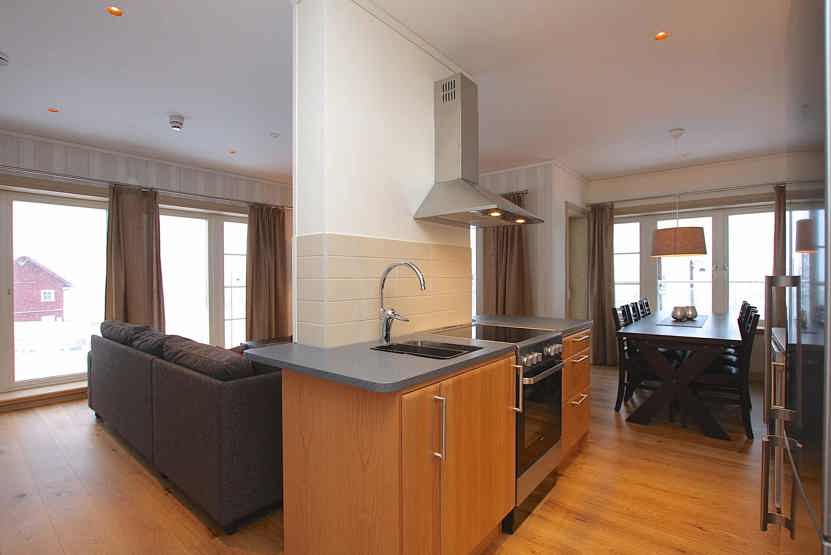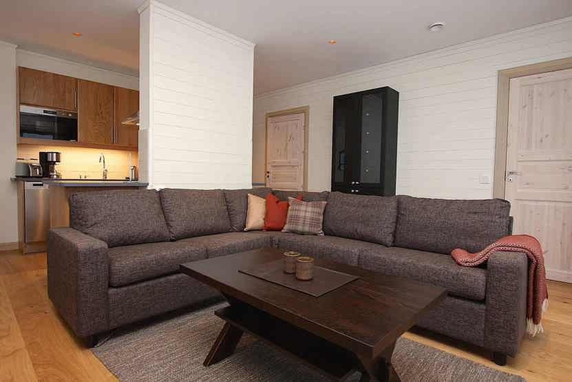 Stue med TV, lille køkkenafdeling. vaskemaskine, tørreskab, skiopbevaring, 2 parkeringspladser.