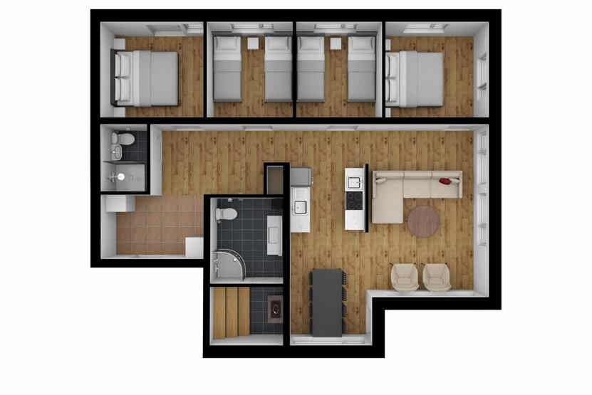 Soveværelse-1 = 1 dobbeltseng. Soveværelse-2 = 2 enkeltsenge. Soveværelse-3 = 2 enkeltsenge. Soveværelse-4 = 1 dobbeltseng.
