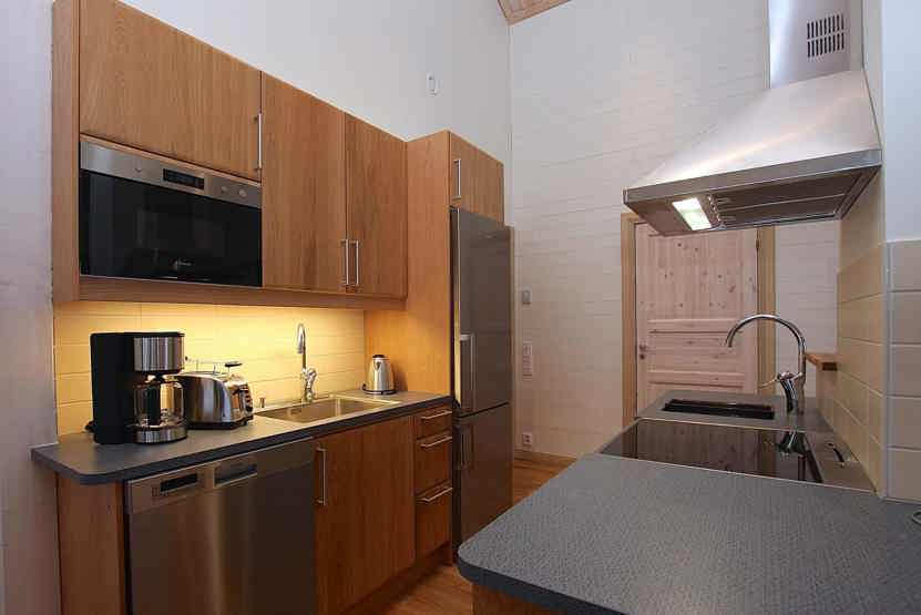 Køkkenet indeholder komfur med ovn, mikro, køleskab med fryser, opvaskemaskine.