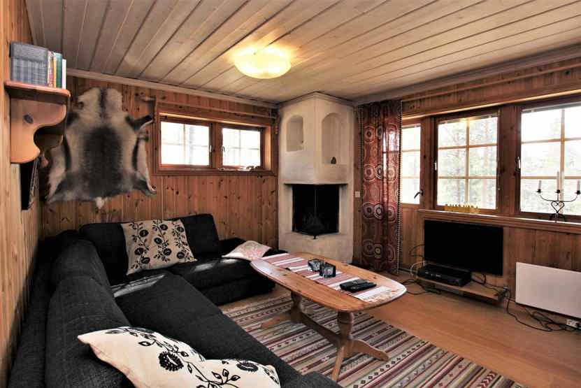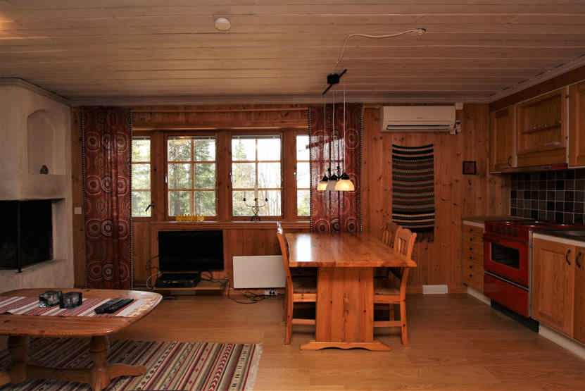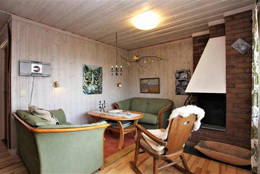 Stue med lille køkkenafdeling, TV, åben pejs (brænde indgår ikke).