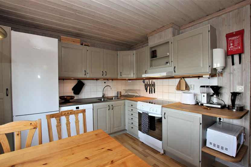 Køkkenet indeholder komfur med ovn, mikro, køleskab med fryser, opvaskemaskine.