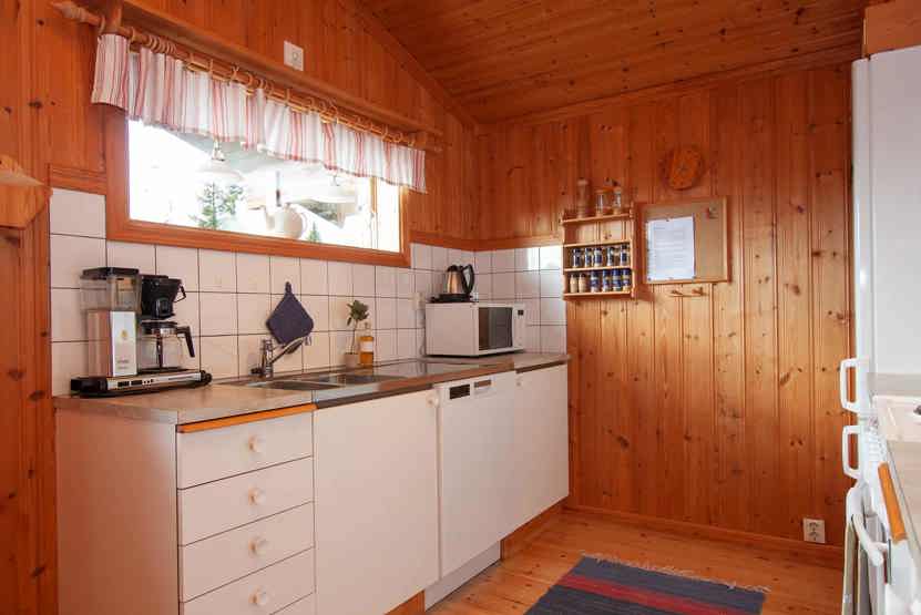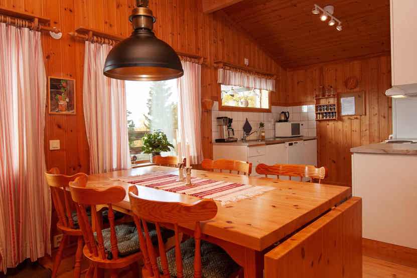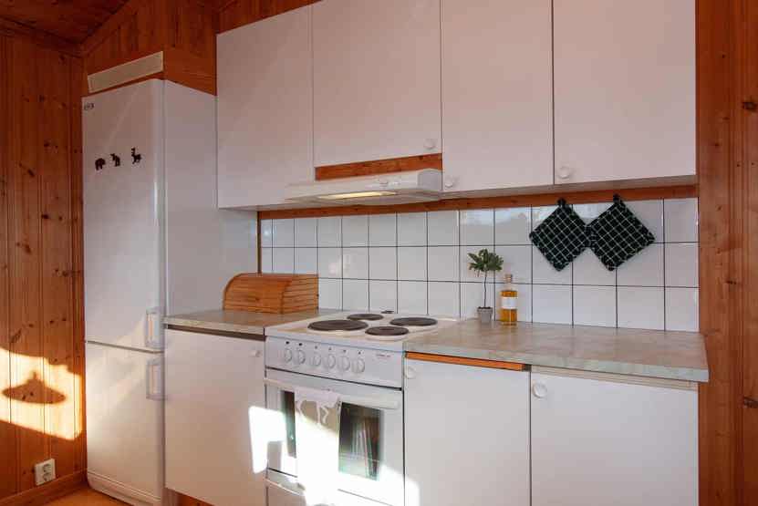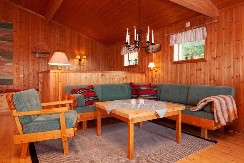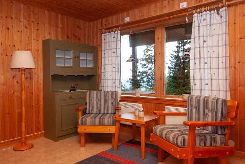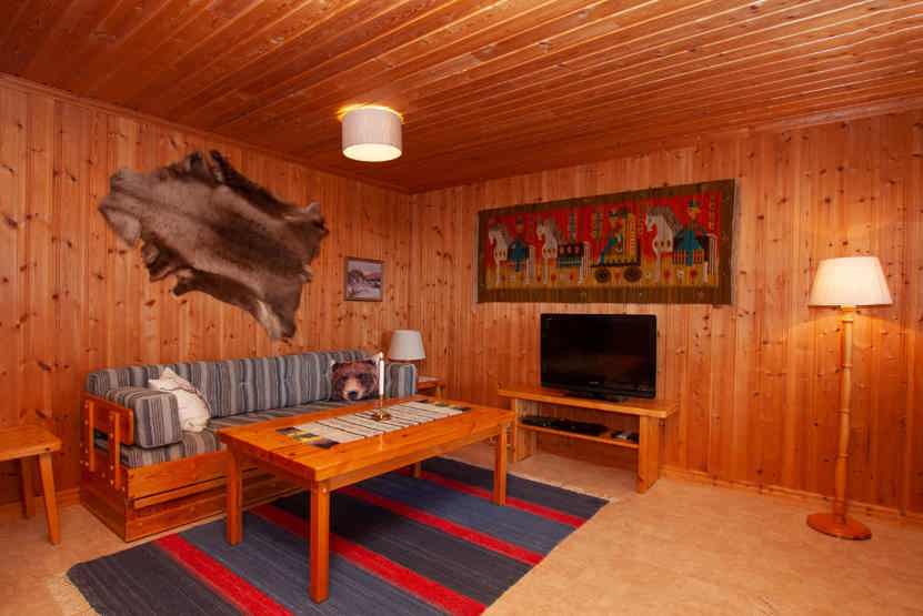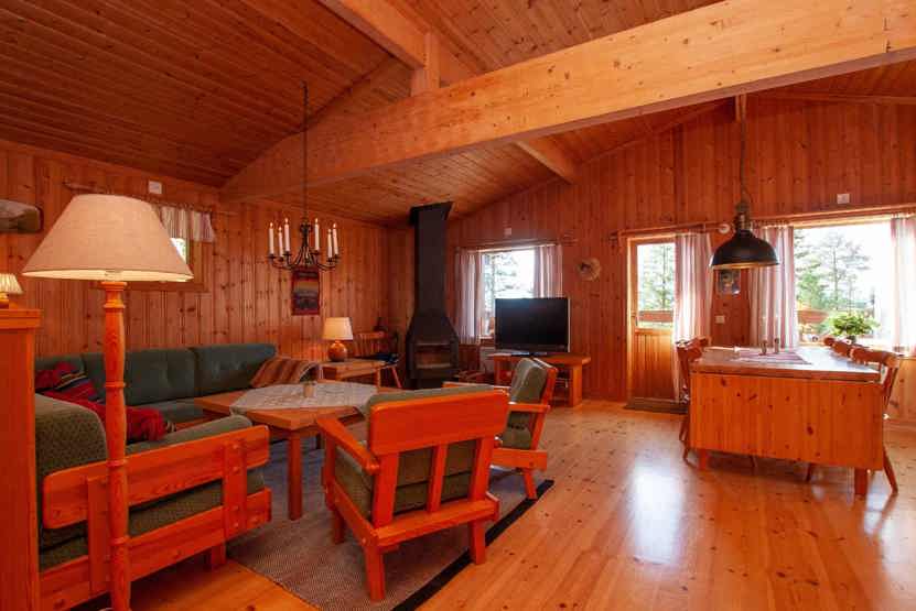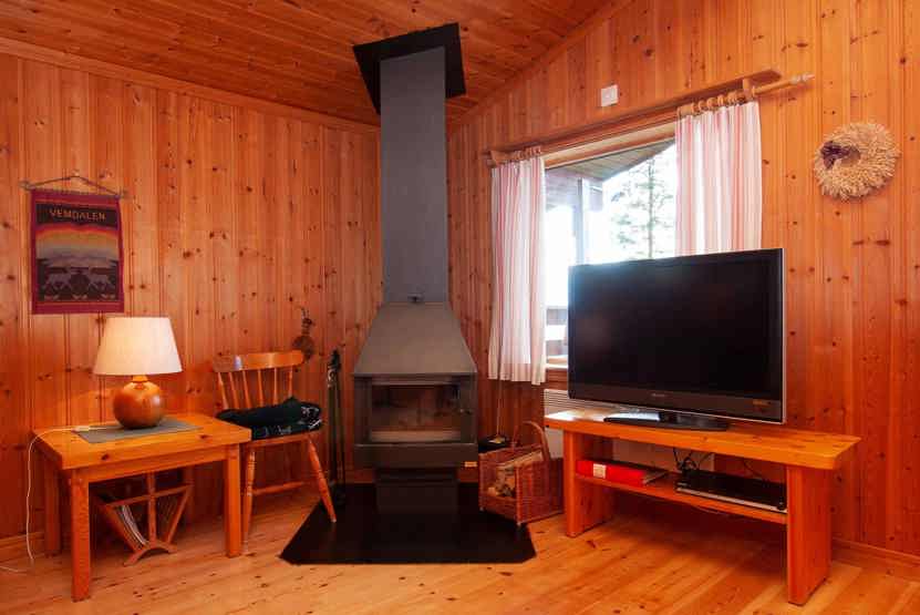 Stue med lille køkkenafdeling, TV, brændeovn (brænde indgår ikke).