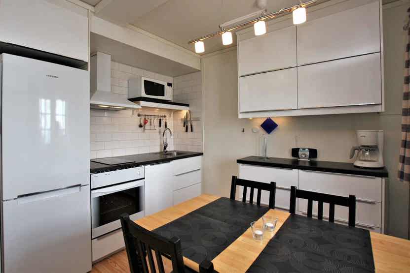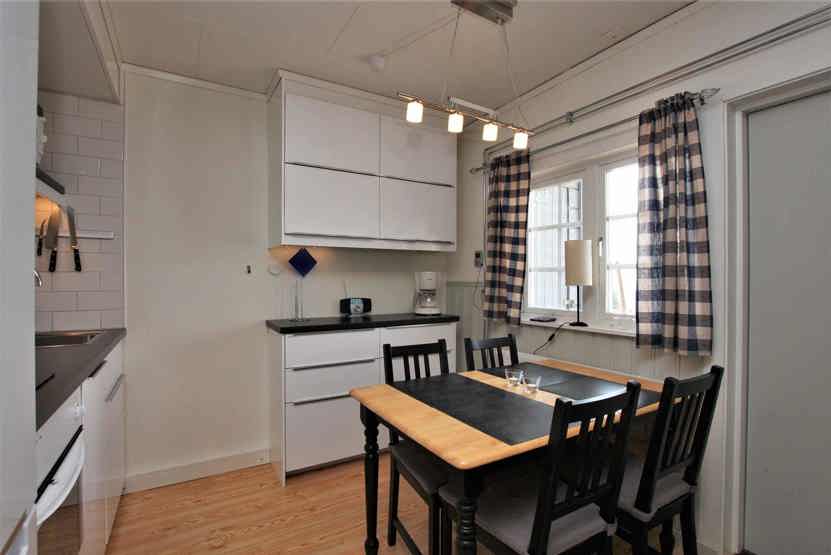 Køkkenet indeholder komfur med ovn, køleskab, fryser, opvaskemaskine, mikro.
