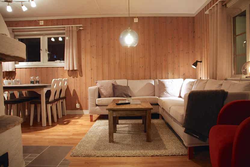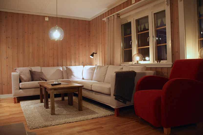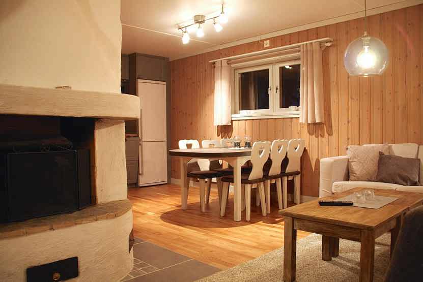Stue med lille køkkenafdeling, TV, åben pejs (brænde indgår ikke).