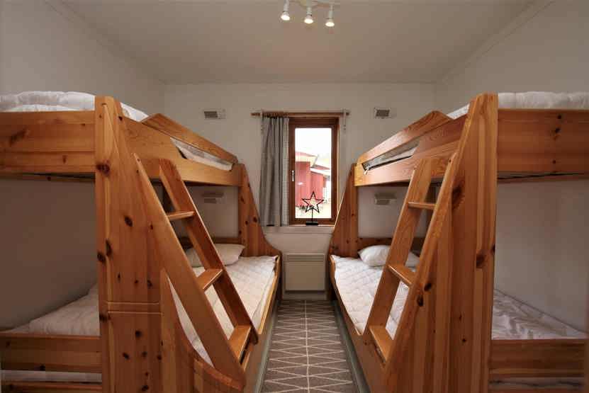 Soveværelse-1 = 1 dobbeltseng. Soveværelse-2 = 1 køjeseng med 120 cm bred underkøje, 1 køjeseng med 105 cm bred underkøje.