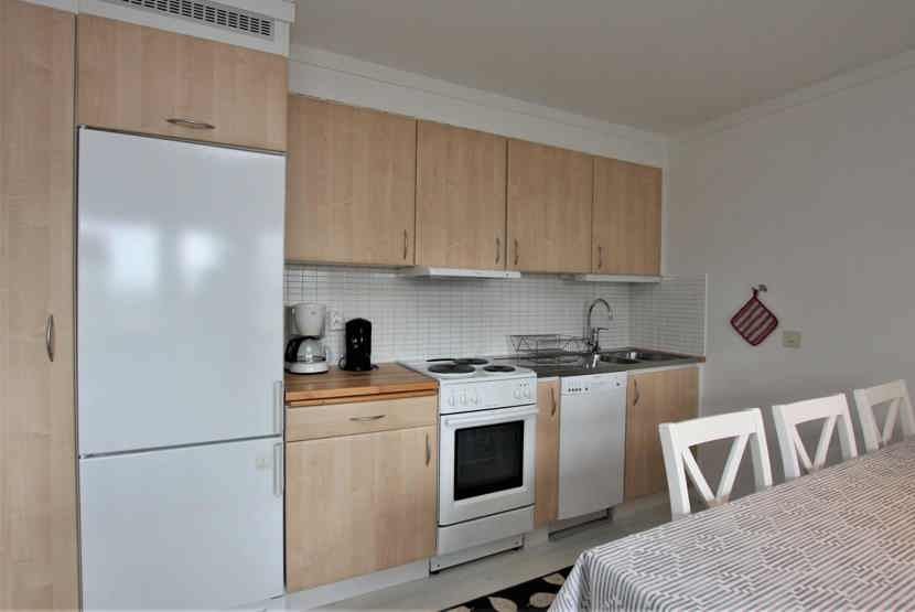 Køkkenet indeholder komfur med ovn, køleskab med fryser, opvaskemaskine, mikro.