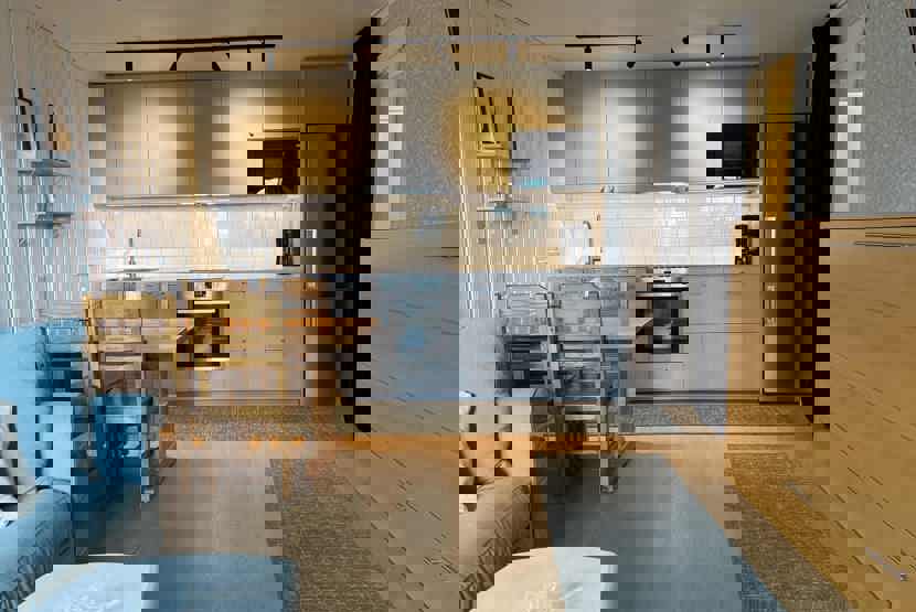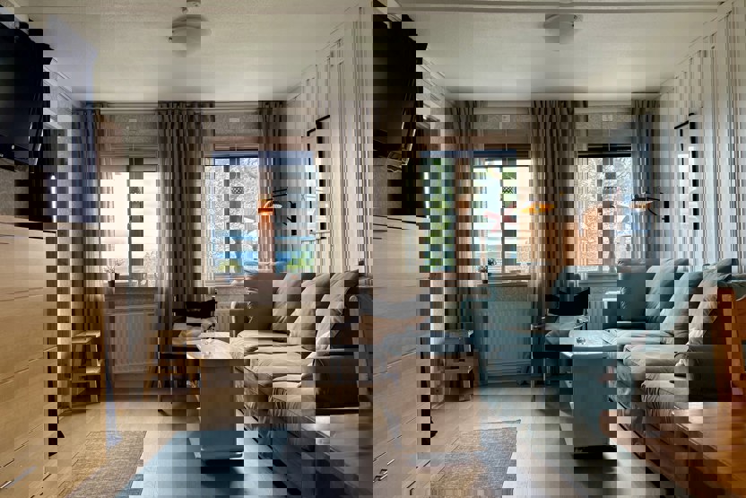 Stue med lille køkkenafdeling, TV, sovesofa 140 cm bred, skabssenge, med 1 plads.