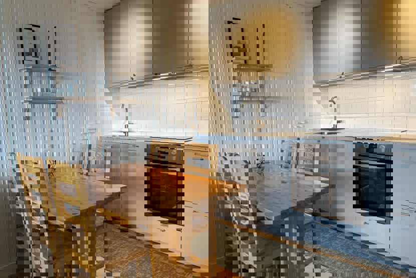 Køkkenet indeholder komfur med ovn, køleskab og fryser, opvaskemaskine, mikro.