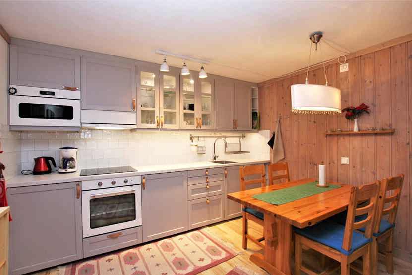 Køkkenet indeholder komfur med ovn, køleskab med fryser, opvaskemaskine, mikro.
