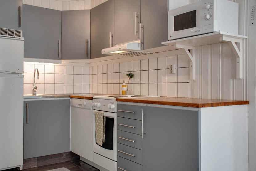 Køkkenet indeholder komfur med ovn, køleskab, lille fryser, opvaskemaskine, mikro.