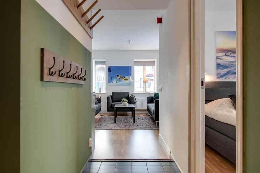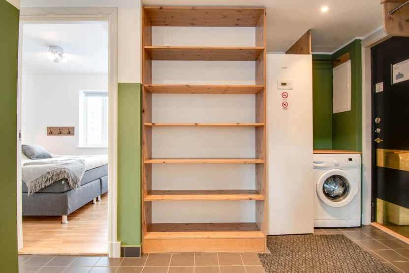 vaskemaskine, tørreskab, altan/udeplads (der skovles ikke sne), skiopbevaring, med en fælles indgang, elevator findes i huset, 2 parkeringspladser.