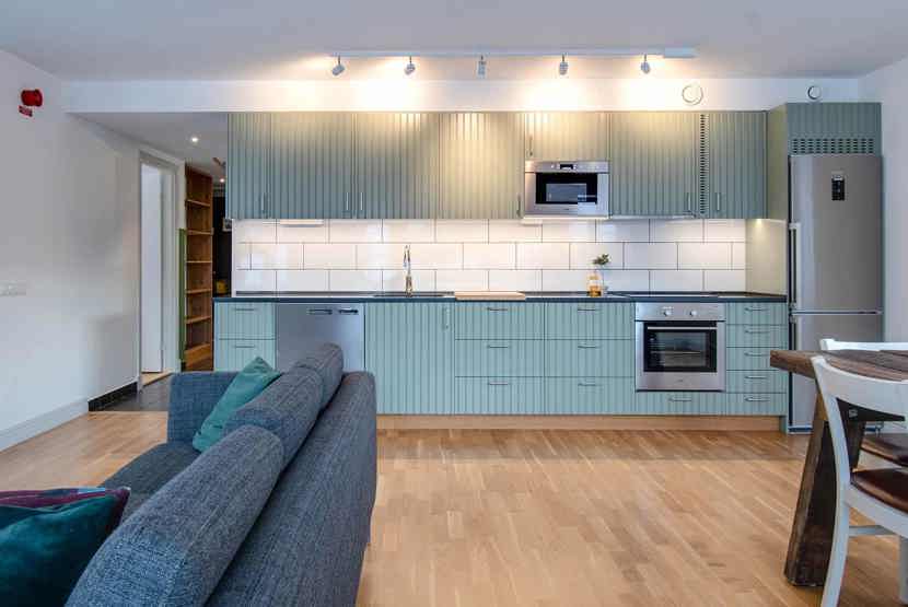 Køkkenet indeholder komfur, ovn, køleskab med fryser, opvaskemaskine, mikro.