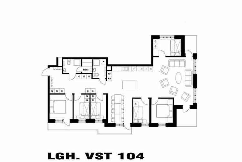 Soveværelse-1 = 1 dobbeltseng. Soveværelse-2 = 1 dobbeltseng. Soveværelse-3 = 1 køjeseng med 120 cm bred underkøje og 80 cm bred overkøje. Soveværelse-4 = 1 køjeseng med 105 cm bred underkøje og 80 cm bred overkøje. Soveværelse-5 = 1 køjeseng med 105 cm bred underkøje og 80 cm bred overkøje. Soveværelse-6 = 1 køjeseng med 105 cm bred underkøje og 80 cm bred overkøje.