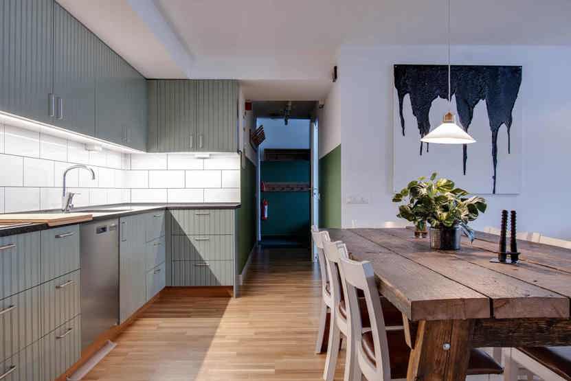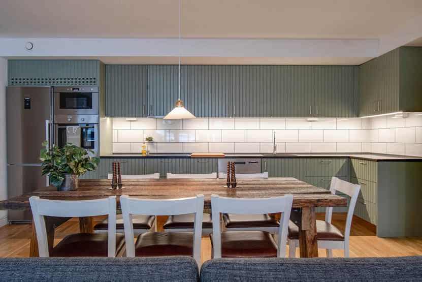 Køkkenet indeholder komfur, ovn, køleskab med fryser, opvaskemaskine, mikro.