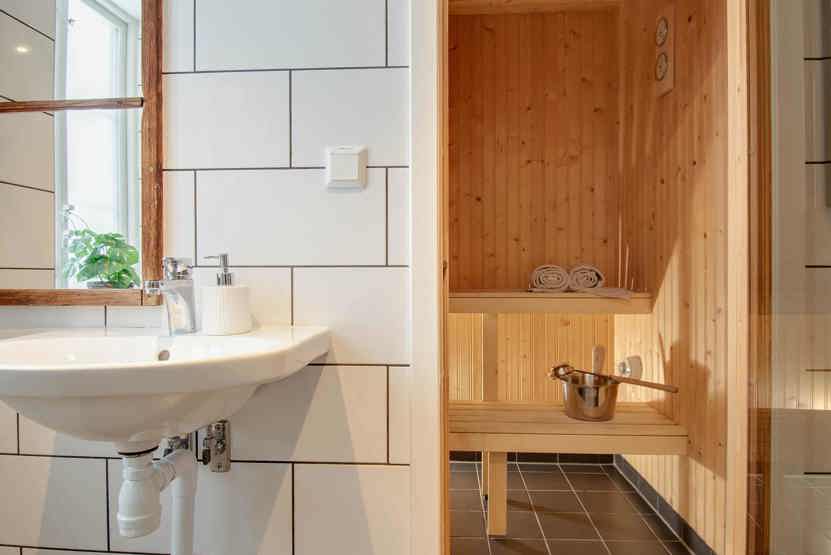 Badeværelse 1 = bruser/WC/sauna. Badeværelse 2 = bruser/WC.