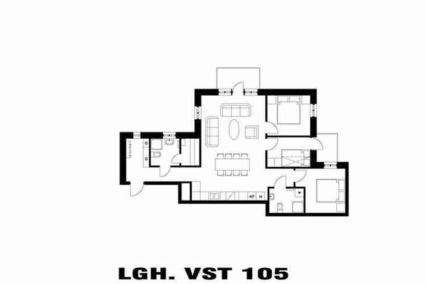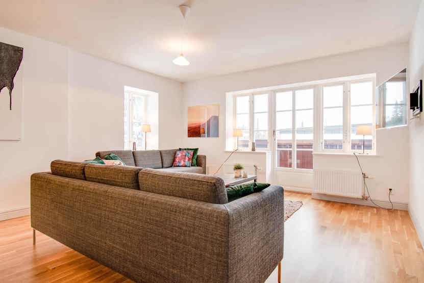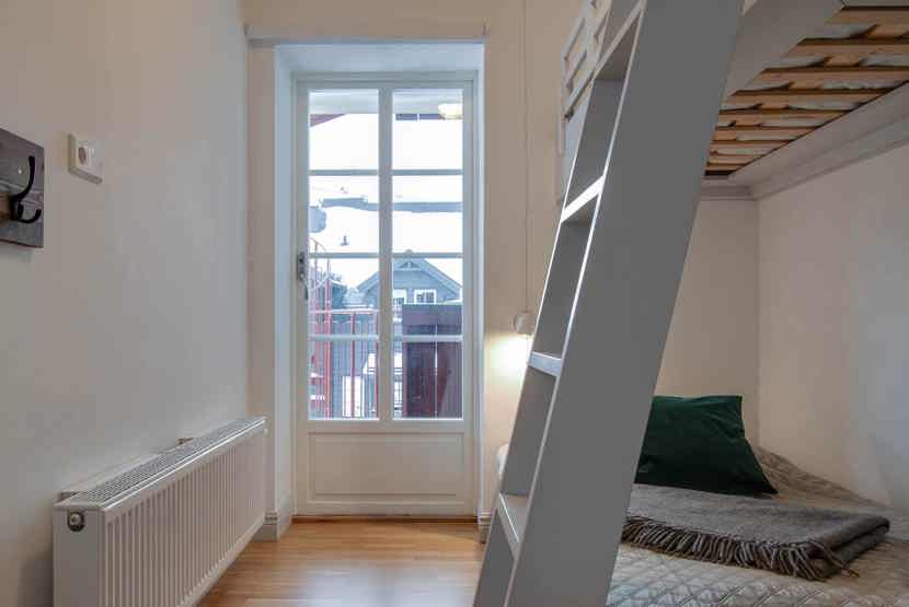 Skalets torg, Bagerihuset ligger i Vemdalsskalet. Lejlighed, Placeret på 3. etage, 6 sengepladser, 82 kvm, alrum med køkkenafdeling, 3 soveværelse, 2 brusere, 2 WC, sauna.