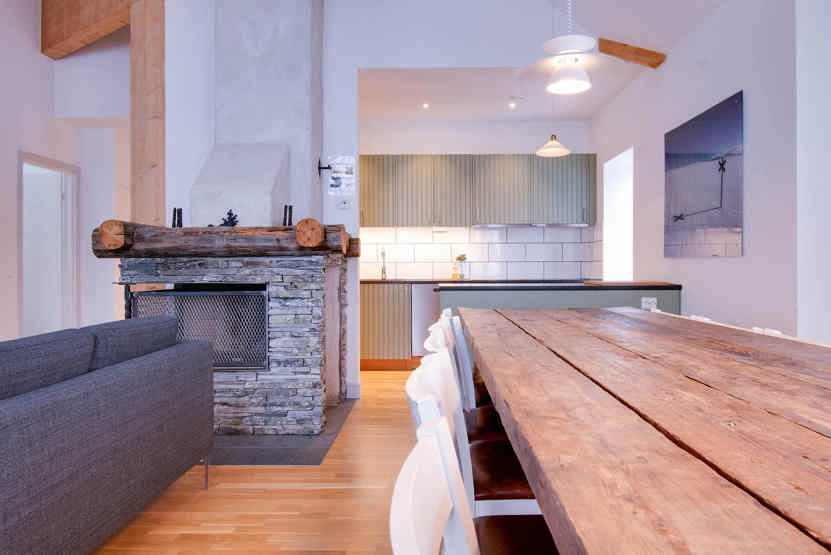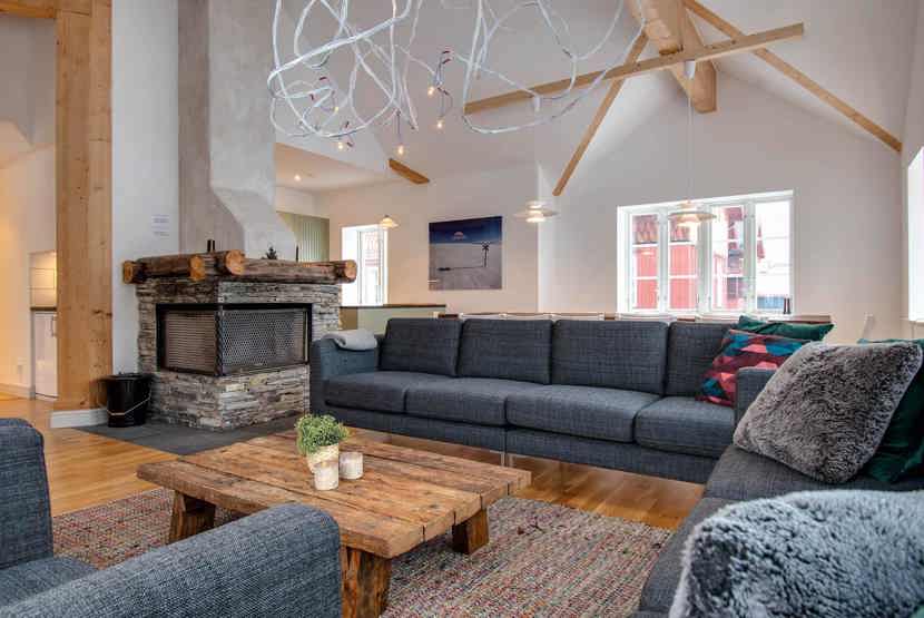 Stue med åben pejs (brænde indgår ikke), lille køkkenafdeling, TV.
