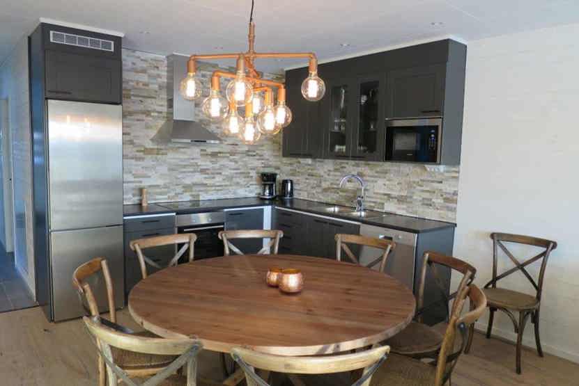Køkkenet indeholder komfur med ovn, køleskab med fryser, opvaskemaskine, mikro.