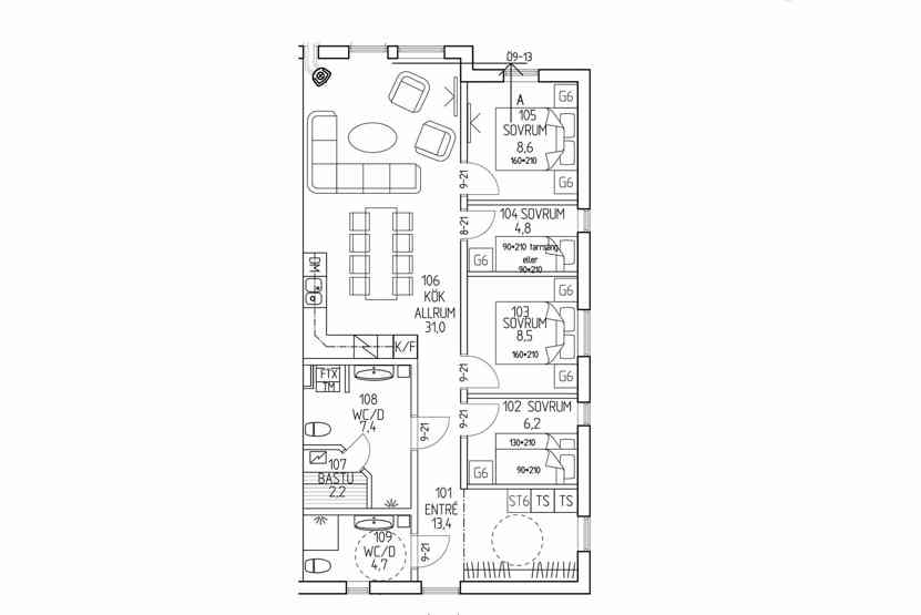 Blästervallen ligger i Björnrike. Lejlighed i stueetage, 8 sengepladser, 93 kvm, alrum med køkkenafdeling, 4 soveværelse, 2 brusere, 2 WC, sauna.