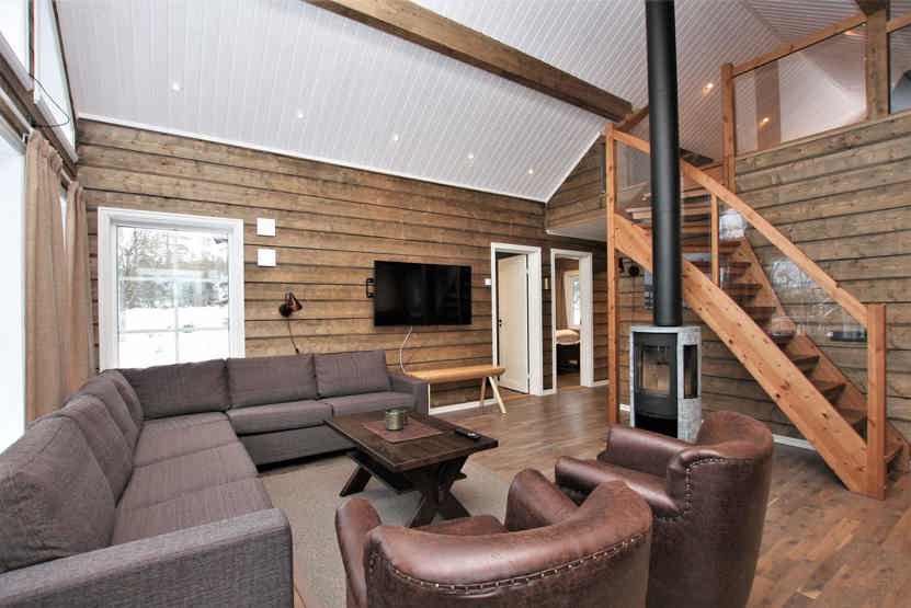 Stue med TV, lille køkkenafdeling, brændeovn (brænde indgår ikke).
