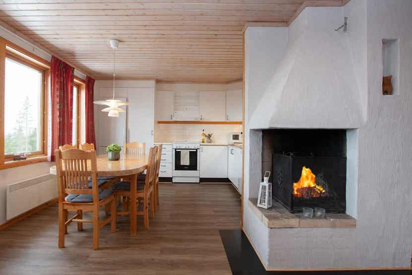 Stue med lille køkkenafdeling, TV, åben pejs (brænde indgår ikke).