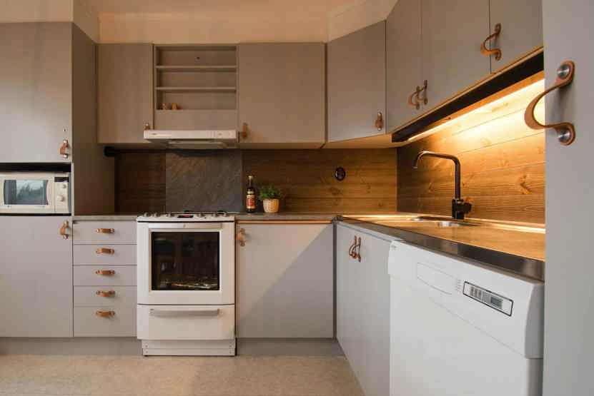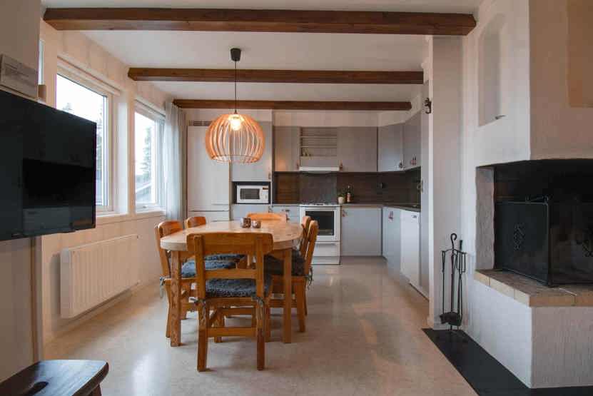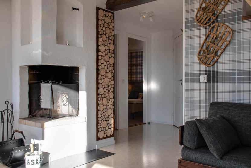 Stue med lille køkkenafdeling, TV, åben pejs (brænde indgår ikke).