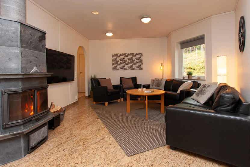Stue med lille køkkenafdeling, TV, brændeovn (brænde indgår ikke).