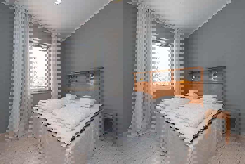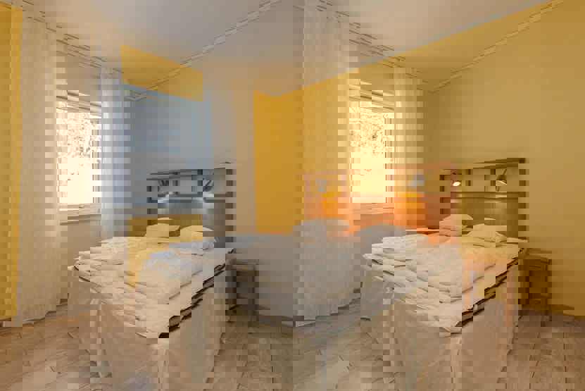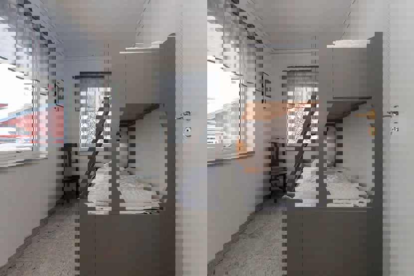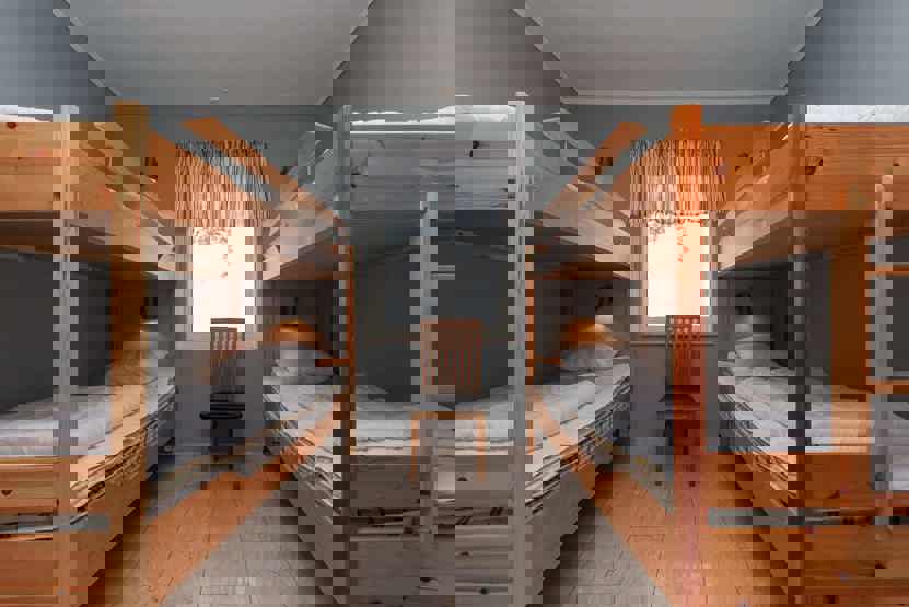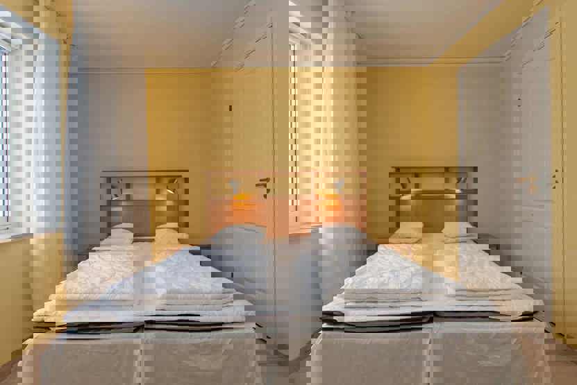 Soveværelse-1 = 1 dobbeltseng 180 cm bred. Soveværelse-2 = 1 dobbeltseng 180 cm bred. Soveværelse-3 = 1 dobbeltseng 180 cm bred. Soveværelse-4 = 1 køyeseng med 120 cm bred underkøye og 80 cm bred overkøye. Soveværelse-5 = 2 køjesenge hvor både over og underkøje er 80 cm bred.