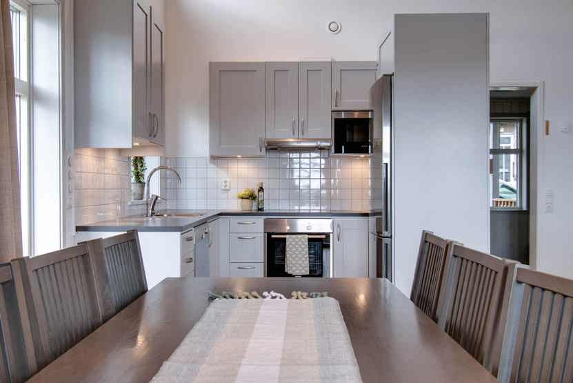 Køkkenet indeholder komfur med ovn, mikro, køleskab med fryser, opvaskemaskine.