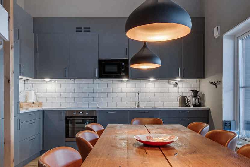 Køkkenet indeholder komfur med ovn, køleskab, fryser, opvaskemaskine, mikro.