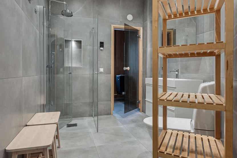 Badeværelse 1 = bruser/WC/sauna. Badeværelse 2 = bruser/WC.
