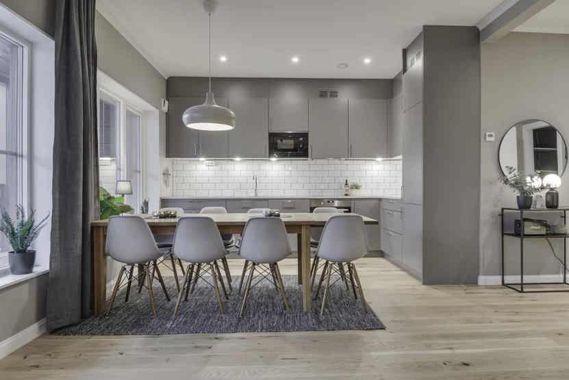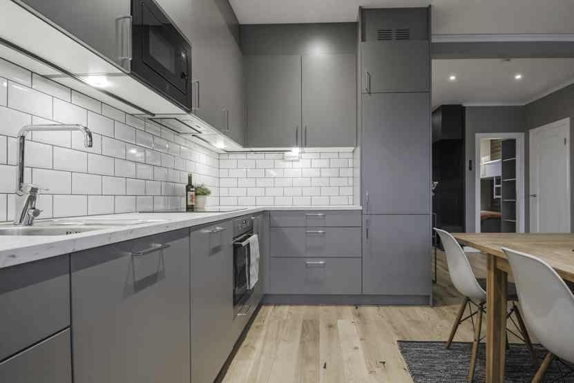 Køkkenet indeholder komfur med ovn, køleskab, fryser, opvaskemaskine, mikro.
