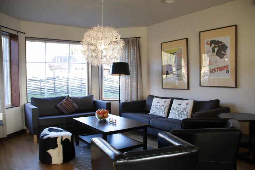 Grizzlyhusen ligger i Björnrike. Lejlighed i stueetage, 8 sengepladser, 89 kvm, alrum med køkkenafdeling, 4 soveværelse, 2 brusere, 2 WC, sauna.
