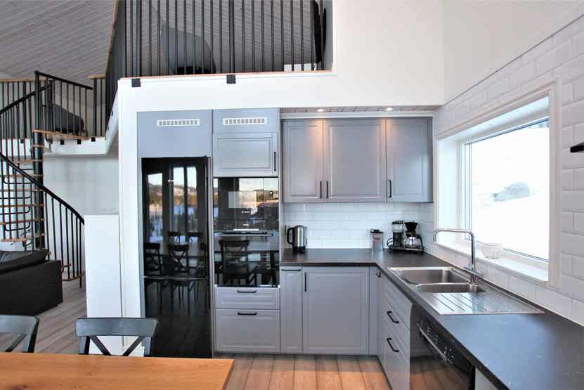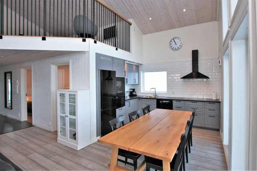 Køkkenet indeholder ovn, mikro, køleskab med fryser, komfur, opvaskemaskine.